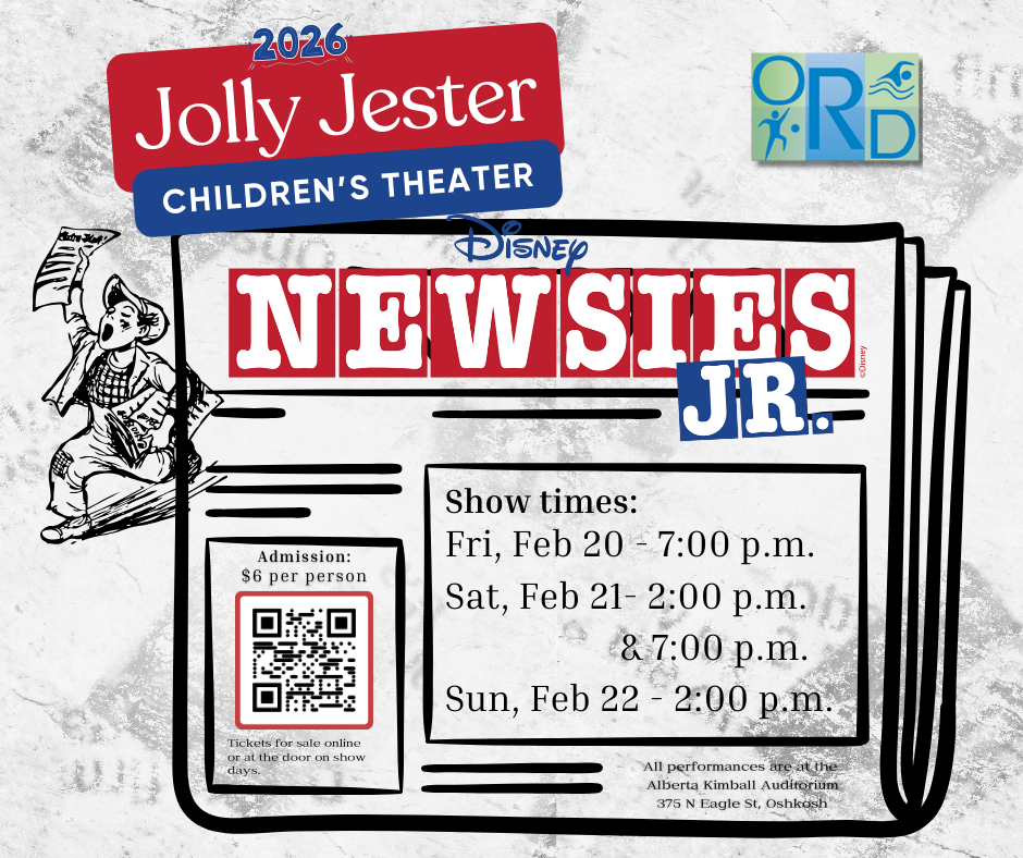 Jolly Jester Children’s Theater is a musical theater opportunity for children in 1st grade through 8th grade. Our production this year will be Disney’s “Newsies, Jr.”.